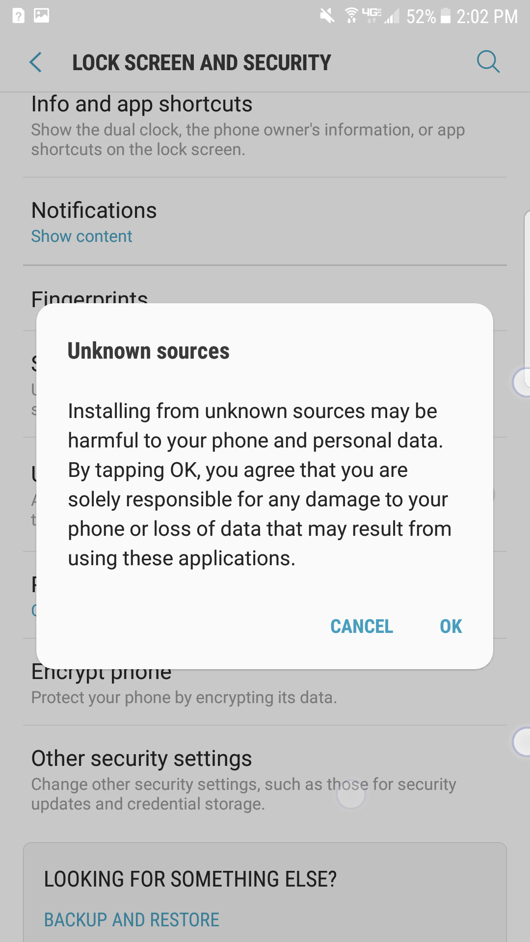 Scroll down to Unkown sources and toggle on.